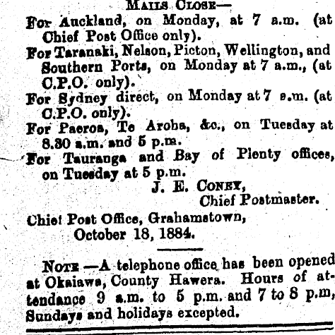 Maiis Closk — Fo* Auckland, on Monday, at 7 a.m. (at Chief Post Office only). For Taranaki, Nelson, Picton, Wellington, and Southern Ports, on Monday at 7 a.m., (at 0.P.0. only).' For Sydney direct, on Monday at 7 a.m. (at G.P.O. only). For Paeroa, Te Arabs, &0., on Tuesday at 8.80 ».m. »nd 6 p.m. — 'For Twwanga and Bay of Plenty offices, on Tuesday at 5 p.m. J. E. Covsx, Chief Postmaster. Chief Post Office, Grahamstown, October 18,1884, BTow—A telephone office, has been opened at Okwftwn, County Hawera. Hours of attendance 9 a.m. to 6 p.m. and 7to 8 p.m» Sundays and holidays excepted.