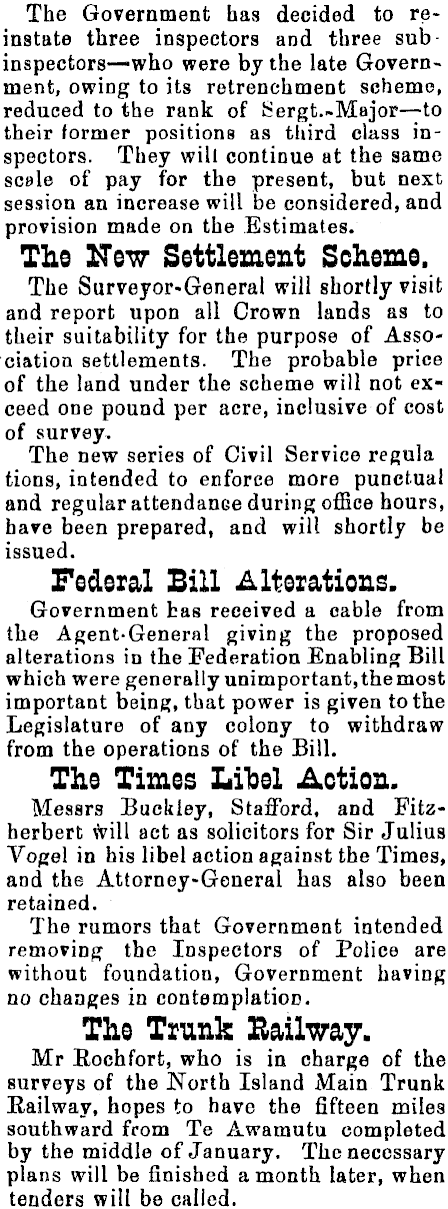 The Government has decided to reinstate three inspectors and three subinspectors—who were by the late Government, owing to its retrenchment scheme, reduced to the rank of Sergt.-Major—to their former positions as third class inspectors. They will continue at the same scale of pay for the present, but next session an increase will be considered, and provision made on the Estimates. The New Settlement Scheme. The Surveyor-General will shortly visit and report upon all Crown lands as to their suitability for the purpose of Asso"ciation settlements. The probable price of the land under the scheme will not exceed one pound per acre, inclusive of cost of survey. The new series of Civil Service regula tions, intended to enforce more punctual and regular attendance during office hours, hare been prepared, and will shortly be issued. Federal Sill Alterations. Government has received a cable from the Agent-General giving the proposed alterations in the Federation Enabling Bill which were generally unimportant, the most important being, that power is given to the Legislature of any colony to withdraw from the operations of the Bill. The Times Libel Action. Messrs Buckley, Stafford, and Fitzherbert will act as solicitors for Sir Julius Vogel in his libel action against the Times, and the Attorney-General has also been retained. The rumors that Government intended removing the Inspectors of Police are without foundation, Government having no changes in contemplation. The Trunk Railway. Mr Rochfort, who is in charge of the surveys of the North Island Main Trunk Railway, hopes to have the fifteen miles southward from Te Awamutu completed by the middle of January. The necessary plans will be finished a month later, when | tenders will be called.