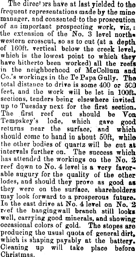 The direcbrs have at last yielded to the frequent representations made by the mine manager, and consented- to the prosecution of an important prospecting work, riz, : the extension of the No. 3 level north* western crosscut, so as to cut (at a depth of 160 ft. vertical below the creek level, which is the lowest point to which they have hitherto been worked) all the reefs in the neighborhood of McCollum and Co.'s workings in the Te Papa Gully. The total distance to drive is some 400 or SCO feet, and the work will be let in 100 ft. sections, tenders being elsewhere invited up to Tuesday next for the first section. The first reef cut should be You Tempskey's lode, which gave good returns near the surface; and which should come to hand in about 50ft, while the other bodies of quartz will be cut at intervals further on. The success which has attended the workings on the No. 2 reef down to No. 4 level is a very favor* able augury for the quality of the other lodes, and should they prove as good as they were on the surface, shareholders may look forward to a prosperous future. In the east drive at No. 4 level on No. 2 reef the bangingwall branch still looks well, carrying good minerals, and showing occasional colors of gold. The stopes are producing the ususl quota of general dirt, which is shaping payably at the battery. Cleaning up will take place before Christmas.