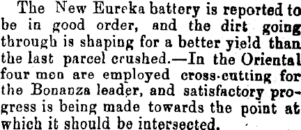 The New Eurrka battery is reported to be in good order, and the dirt going through is shaping for a better yield than the last parcel crushed.—ln the Oriental four men are employed cross-catting for the Bonanza leader, and satisfactory progress is being made towards the point at which it should be intersected.