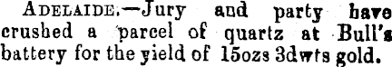 Adelaide.—Jury and party hare crushed a parcel of quartz at Bull's battery for the yield of 15ozs 3dwts gold.