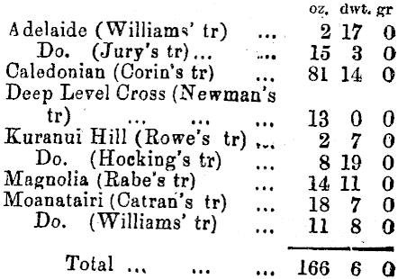 Adelaide (Williams' tr) Do. (Jury's tr)... Caledonian (Corin's tr) Deep Level Cross (Newman's tr) Kuranui Hill (Eowe's tr) .< Do. (Hocbing's tr) Magnolia (Kabe's tr) Moanatairi (Catrari's tr) Do. (Williams' tr) oz. chvt. ffr 2 17 0 15 3 0 81 14 0 13 0 0 2 7 0 8 19 0 14 11 0 18 7 0 11 8 0 Total 166 6 Q