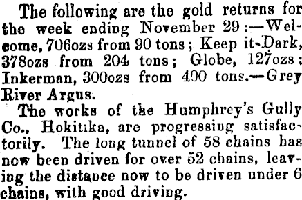 The following are the gold returns for the week ending November 29:—Welcome, 7060zs from 90 tons; Keep it-.Dark, 3780zs from 204 tons; Globe, 1270z5; Inkerman, 300ozs from 490 tons.—Grey River Argns. The works of tke Humphrey's Gully Co., Hokitika, are progressing satisfactorily. The long tunnel of 58 chains has now been driven for over 52 chains, leaving the distance now to be driven under 6 chains, with good driving.
