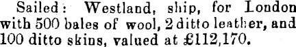 Sailed: Westland, ship, for London with 500 bales of wool, 2 ditto leather, and 100 ditto skins, valued at £112,170.