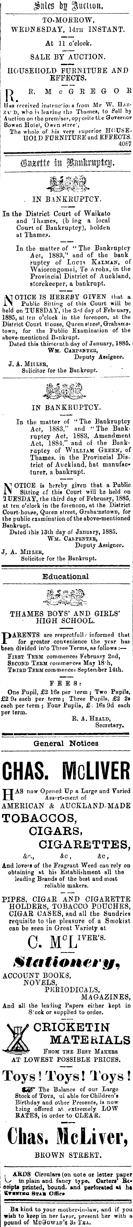 b% gtucuoiu TO-MOEEOW, WEDNESDAY, Mth INSTANT. At 11 o'clock. SALE BY~AUCTION. HOUSEHOLD FURNITURE AND EFFECTS. r> U. M c G R E G O R Uaa rrceired instruc'ioi s from Mr W. H^zzv D, wbo h leaving iho Thames, to Sell by Auction on the premise?, opposite tLe Governor Bowen Hotel, Owen stree", The whole of his very fuper;or HOUSEHOLD FURNITURE and EFFECTS. 4067 . IN BANKRUPTCY. In the District Court of Waikato and Thames, (b ing a local Court of Bankruptcy), holden at Thames. In the matter of " The Bankruptcy Act, 1883,'' and of the bank ruptcy of Locis Kalman, of Waiorongomai, Te Aroha, in the Provincial District of Auckland, storekeeper, a bankrupt. NOTICE IS HEREBY GIVEN that a Public Sitting of this Court will bo i held on TUESDAY, ihe 3rd daj of February, 1885, at ten o'clock in the forenoon, at the District Court House, Queen street, G-rahareis-town, for the Public Examination of the above-mentioned Bankrupt. | Dated this thine?nth day of January, 1885. We Gabpbmteb, Deputy Assignee. J. A. MIiXEB, Solicitor for the Backrupt. IN BANKRUPTCY. In the matter of "The Bankruptcy Act, 1883," and "The Bankruptcy Act, 1883, Amendment Act, 1884." and of the Bankruptcy of William Gbeen, of Thames, in the Provincial District ofAuckland.bat manufacturer, a bankrupt. r OTICE is hereby given that a Public V Sitting of this Court will ba held on TUESDAY, the third day of February, 1885, at ten o'clork in the forenoon, nt the District Courthouse, Queen Btreet, Grabaoistown, for the public examination of the above-mentioned Bankrupt. Dated ibis 13tb day of January, 1885. WM. CAtPEKTJB, Deputy Assignee. J, A. Miiieb, Solicitor for the Bankrupt. Educational THAMES BOYS' AND GIRLS' HIGH SCHOOL. PARENTS are respectfully informed that for greater convenience the year has been divided in'o Three Terms, as follows :— FIEST Tebm commences February 2nd, Second Teem commences May 18'h, Thibd Tebm commences September Mth. FEES: One Pupil, £2 16s per term ; Two Pupils, £2 9s each per term; Three Pupils, £2 2b each per term ; Four Pupils, £, 16s 9d each per term. R. A. Heald, Secretary. General Notices CHAS. MCLIVER HAS now Opened Up a Large and Varied ABBfrt«inent of AMERICAN & AUCKLAND-MADE TOBACCOS, CIGARS, CIGARETTES, &% Ac, &c, And lovers of tbe Fragrant Weed can rely on obtaining nt his Establishment all the leading Brands of the beßt and most reliable makers. PIPES, CIGAR AND CIGARETTE HOLDERS, TOBACCO POUCHES, CIGAR CASES, and all the Sundries requisite to the pleasure of a Scnokist can be seen in Great Variety at 0. U C_L IVEU'S' Stationery, ACCOUNT BOOKS, NOVELS, PERIODICALS, MAGAZINES, And all the leadiug Papers either kept in Slock or supplied to order. W CRICKETIN J|[ MATERIALS i '«gWjpg Fbom the Best Makebs | AT LOWEST POSSIBLE PRICES. Toys! Toys! Toys! (3P** The Balance of our Large Stock of Toys, vi able for Children's Birthday and other Presents, is now baing offered a*; extremely LOW RATES, in order to OLEAR. (has. icliver, BROWN STREET. , ARDS Circulars (on note oi letter paper L> in plain and fancy type. Garten* Reeoipt* printed, bound, and perforated at hft Svhwivo Bt*» Offica Br kind to your mother-in-law, and if you wish to keep in her favor, present her with a pound of MoGJowan's 3s Tea.