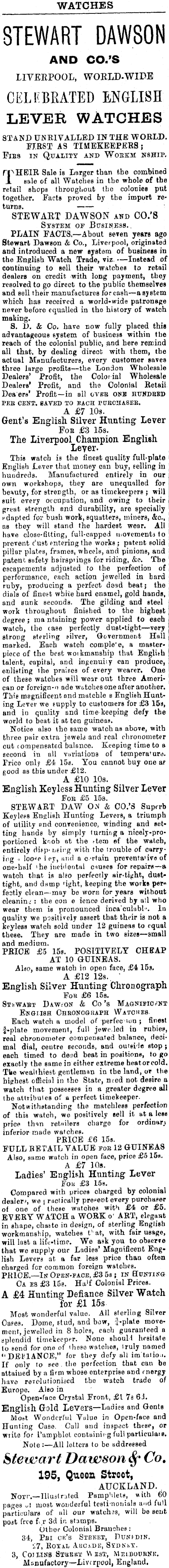 WATCHES STEWART DAWSON AND CO.'S i LIVERPOOL, WORLD-WIDE | CELEBRATED ENGLISH LEVER WATCHES STAND UNRIVALLED IN THE WORLD. FIRST A3 TIMEKEEPERS 5 Fibs in Quality and Woekm nship. fPHEIRSaIeis Larger than tbe combined X sale of all Watches in the whole of the retail shops throughout the colonies put together. Facts proved by the impurt returns. STEWART DAWSON and CO.'S System of Business.. PLAIN FACTS.—About seven years ago Stewart Dawson & Co., Liverpool, originated and introduced a new system of business in the English Watch. Trade, viz. —Instead of continuing to Bell their watches to retail dealers on credit with long payment, they resolved to go direct to the public themselves and sell their manufactures for cash —a system which has received a world-wide patronage never before equalled in the history of watch making. S. 13. & Co. have now fully placed this advantageous system of business within the reach of the colonial public, and here remind all that, by dealing direct with them, the actual Manufacturers, every customer saves three large profits—the London Wholesale Dealers' Profit, the Color ial Wholesale Dealers' Profit, and the Colonial Retail Dea ers' Profit—in all over oub htthdebd PEB CENT. SAVED TO EACH PURCHASER. A £7 10s. Gent's English Silver Hunting Lever Foe £3 15s. The Liverpool Champion English Leyer. This watch is the finest quality full-plate English Lever that money can buy, selling in huudreds. Manufactured entirely in our own workshops, they are unequalled for beauty, for streEgth, or as timekeepers 5 will suit every occupation, and owing to their great strength and durability, are specially ndapted for bush work, squatters, miners, &c, as they will stand the hardest wear. All have close-fitting, full-capped movements to prevent c'ust entering the works; patent solid pillar plat.es, frames, wheels, and pinions, and patent safety hairsprings for riding, &c. The escapements adjusted to the perfection of performance, each action jewelled in bard ruby, producing a perfect daad beat; the dials of finest white hard enamel, gold hands, and sunk seconds. The gilding and steel work throughout finished to the highest degree; ma ntaining power applied to each watch, the case perfectly dust«tight—very strong sterling silver, Government Hull marked. Each watch comple'e, a masterpiece of the best woikmanship that Englith talent, capital, and ingenuity can produce, enlisting the praises of every wearer. One of theße watches will wear out three American or foreign-n ade watches one after another. This magnificent and matchle s English Hunting Lever we supply to customers for £3 15a, and in quality and time keeping defy the world to beat it at ten guineas. Notice also the same watch as above, with three pair extra jeweld and real chronometer I cut compensated balance. Keeping time to a second in all variations of tempera*ura. Price only £4< 15s. You cannot buy one ap good as this under £12. A £10 10s. English Keyless Hunting Silver lever Foe £5 15s. STEWART DAW ON & CO.'S Superb Keyless English Hunting Levers, a triumph of utility and convenience, winding and setting hands by simply turning a nicely-pro-porfcioned knob at the rtem »f the watch, entirely rli*p>neirg with the irouble of carrying 1 1oo jp Icy, «nd a c-rtain preventa'ive of one-half 'he itieiiiental causes for repairs—a watch that is also perfectly air-tight, dusttight, and dump 'ight, keeping the works per* [ feotly clean —may be worn for years without cleaning : the con c ience derived by all who j wear them is pronounced inca'culabl-. In quality we positively assert that their is not a keyless watch sold under 12 guineas to equal these. They are made in two sizes—small and medium. 1 PRICE £5 15s. POSITIVELY CHEAP AT 10 GUINEAS. Also, same watch in open face, £4 153. A £12 12a.. • English Silver Hunting Chronograph Fob £6 15a. SThWABT DAWcON & Co 'S MaONIPIOpNT Ebgiish Chronograph Watches. Each watch a model of perfection ; finest f-plate movement, full jeweled in rubies, real chronometer compensated balance, decimal dial, centre seconds, and outside stop; each timed to dead beat in positions, to go exactly the same in either extreme heat or cold. Tbe wealthiest gentleman in the land, or the highest official in the State, n;ed not desire a watch that possesses in a greater degree all the attributes of a perfect timekeeper. Notwithstanding the matchless perfection of this watch, we positively sell it at a less price thin retailers charge for ordinary inferior made watches. PRICE £6 15s. FULL RETAIL VALUE foe 12 GUINEAS Also, same watch in open face, price £5155. A £7 10s. Ladies' English Hunting Lever Fou £3 15s. Compared with prices charged by colonial dealer', we (radically present every purchaser of one of these watches wit^i £4 or £5. EVERY WATCH a WORK o' ART, elegant in shape, chaste in deeign, of sterling English workmanship, watches t' at, with fair usage, will last a life-limp. We ask you to observe that we supply our Ladies' Magnificent English Levers at a far less price than often charged for common foreign watches. PRICE.-—ln Open-face, £3 ss; in Bunting Ca ES £3 15s. Ha'f Colonial Prices. A £4 Hunting Defiance Silver Watch for £1 15s Most wonderful value. All sterling Silver Capes. Dome, stud, and bow, Opiate movement, jewelled in 8 holes, each guaranteed a splendid timekeeper. None shouH hesitate to send for one of these watcließ, truly named "DEFIANCE," for they defy oil ira tatio;i. If only to see, the perfection that can be attained by a firm whose enterprise and energy have revolutionised tbe watch trade of Europe. Also in Open-face Crystal Front, £l 7s 6i. English Gold Levers—Ladies and Gents Moot Wonderful Yulue in Open-face and | Hunting Case. Call and inspect these, or write for L'ampblol containing full particulars. J Note :—All letters to be addressed Stewart Dawson Sp Co. 195, Queen Street, ' AUCKLAND. . Nottv- Illuslr^ted Pamp'Uets, with 6