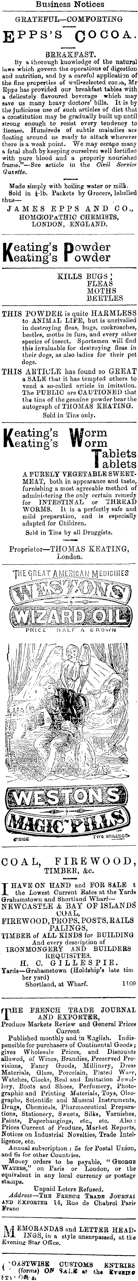 Business Notices GRATEFUL—COMFORTING EPPS'S^QOCOA. BREAKFAST. By a thorough knowledge of the natural laws which govern the operations of digestion and nutrition, and by a careful application of the fine properties of WQll"selected coc:/a, Mr Kpps has provided our breakfast tables with a delicately flavoured beverage which may save us many heavy doctors' bills. It is by the judicious use of such articles of diet that a constitution may be gradually buill up until strong enough to resist every tendency to disease. Hundreds of subtle maladies are floating around us ready to attack whsrever there is a weak point. We may escape many a fatal shaft by keeping ourselves well fortified with pure blood and a proparly nourished frame."—See article in the Civil Service Gaitette. Made simply with boiling water or milk. Sold in i-lb. Packets by Grocers, labelled thus— JAMES EPPS AND CO., HOMOEOPATHIC CHEMISTS, LONDON, ENGLAND. Keating' s powder eating's lowder KILLS BUGS J FLEAS MOTHS BEETLES THIS POWDER is quite HARMLESS to ANIMAL LIFE, but is unrivalled in destroying fleas, bugs, cockroaches, beetles, moths in furs, and every other species of insect. Sportsmen will find this invaluable for destroying fleas in their dogs, as also ladies for their pet dogs. THIS ARTICLE has found so GREAT a SALE that it has tempted others to vend a so-called article in imitation. The PUBLIC are CAUTIONED that the tins of the genuine powder bear the autograph of THOMAS KEATING. Sold in Tins only. K eating's UJorm eating's ft orm Tablets 1 ablets A PURELY VEGETABLE SWEETMEAT, both in appearance and taste, furnishing a most agreeable method of admini-tering the only certain remedy for INTESTINAL or THREAD WORMS. It is a perfectly safe and mild preparation, and is especially adapted for Children. Sold in Tina by all Druggists. Proprietor—THOMAS KEATING, London. 7HE CjREAT^M£RIgAN_I^ EDICINES PRICE HALF A CROWN COAL, FIREWOOD, TIMBER, &c. I HAVE ON HAND and FOR SALE t the Lowest Current Bates at the Yards Grahamstown and Shortland Wharf — NEWCASTLE & BAY OF ISLANDS COAL, FIREWOOD, PROPS, POSTS, RAILS PALINGS, TIMBER of ALL KINDS for BUILDING And every description of IRONMONGERY AND BUILDERS REQUISITES. H. C. GILL ES P lE. Yards—Grahamstown (Holdship's late tim ber yard) Shortland, at Wharf. 1)09 THE FRENCH TRADE JOURNAL AND EXPORTER, Produce Markets Review and General Prices Current Published monthly and in English. Indispensiblefor purchasers of Continental Goods; gives Wholesale Prices, and Discounts allowed, of Wines, Brandies, Preserved Provisions, Fancy Goods, Millinery, Drese Materials, Glass, Porcelain, Piated Ware, Watches, Clocks, Real and Imitation Jewellery, Boots and Shoes, Perfumery, Photographic and Printing Materials, Toys, Oleographs, Scientific and Musical Instruments, Druge,. Chemicals, Pharmaceutical Preparations, Stationery, Sweets, Silks, Varnishes, Paints, Paperhangings, etc., etc. Also : Prices Current of Produce, Market Reports, Notices on Industrial Novelties, Trade Intelligence, etc. Annual subscription : 5s for Postal Union, and 6a for other Countries. Money orders to be payable, " Geobgb Watebb," on Paris or London, or the equivalent in any local currency or postage stamps. Unpaid Loters Refused. Address —The Ebencu Trade Jottbnai and Kxpobteb 14, Rue de Chabrol Parif Franc jl/| EMORANDAS and LETTER HEAD-.i-vJ. INGS, in a style unsurpassed, at the Evening Star Qffico. i 'OASTWISB CUSTOMS ENTRIES ' ' (forma) OJ» SALfI *r »,h« Evbkdso st\ ' Offi:je>