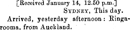 [Received January 14, 12.50 p.m.] Sydney, This day. Arrived, yesterday afternoon: Eingarooma, from Auckland.