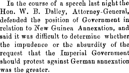 In the course of a speech last night the Hon. W. B. Dalley, Attorney-General, defended the position of Government in relation to New Guinea Annexation, and said it waa difficult to determine whether the impudence or the absurdity of the request that the Imperial Government should protest against German annexation was the greater.