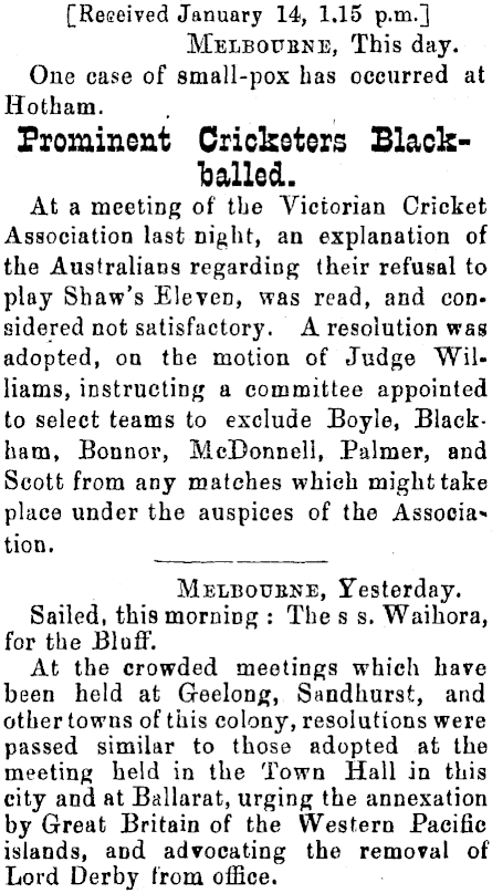 [Received January 14, 1.15 p.m.] Melboubne, This day. One case of small-pox has occurred at Hotham. Prominent Cricketers Blackballed. At a meeting of the Victorian Cricket Association last night, an explanation of the Australians regarding (heir refusal to play Shaw's Eleven, was read, and considered not satisfactory. A resolution was adopted, on the motion of Judge Williams, instructing a committee appointed to select teams to exclude Boyle, Blackham, Bonnor, McDonnell, Palmer, and Scott from any matches which might take place under the auspices of the Association. Melbouene, yesterday. Sailed, this morning : The s s. Waihora, for the Bluff. At the crowded meetings which have been held at Geelong, Sandhurst, and other towns of this colony, resolutions were passed similar to those adopted at the meeting held in the Town Hall in this city and at Ballarat, urging the annexation by Great Britain of the Western Pacific islands, and advocating the removal of Lord Derby from office.