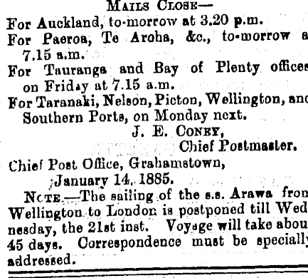 Maim Ckwb — For Auckland, to-morrow at 3.20 p.m. For Paeroa, Te Aroha, &c, to-morrow a 7,15 a.m. «. For Tauranga and Bay of Plenty offices on Frid*y at 7.15 a.m. For Taranaki, Nehon, Picton, "Wellington, and Southern Ports, on Monday next. J. E. Conei, Chief Postmaster. Chief Post Office, Grahamstown, 14, 1885. NcTE.—The sailing of the s.s. Arawa from Wellington to London is postponed till Wednesday, the 21st inst. Voyage will take aboul 45 days. Correspondence must be speciallj addressed.