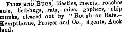 Furs and Bugs, Beetles, insects, roaches ants, .bed-bugs, rats, mice, gopher*, chip' munks, cleared out by " Boi gh on Bats.— Keuiplborue, Proper and Ow., Agents, Auct