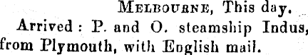 Melbourne, This day. Arrived : P. and O. steamship Indus, from Plymouth, with English mail.