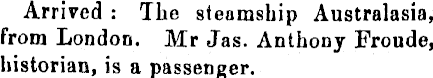 Arrived : The steamship Australasia, from London. Mr Jas. Anthony Froude, historian, is a passenger.