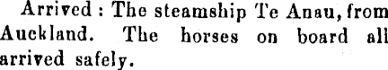 Arrived : The steamship Te Anau, from Auckland. The horses on board all arrived safely.
