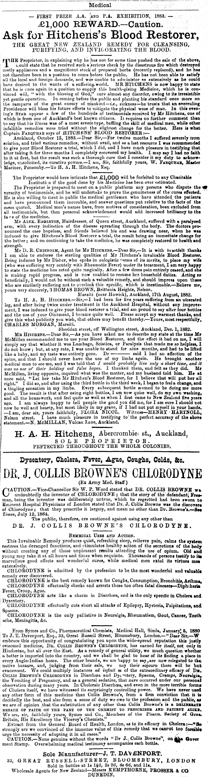 Medical — FIRST PEIZR A.A. [and P.A. EXHIBITION, 1883. — £1,000 REWAKD.—Caution. Ask for Hitcheiis's Blood Restorer, THE GREAT NEW ZEALAND REMEDY FOR CLEANSING, PURIFYING, AND INVIGORATING THE BLOOD. THE Proprietor, in explaining why he has not for some time pushed the lale of the aboye, viould state that he received such a 'serious check by the disastrous fire which destroyed coet),y appliances and a magnificent stock! of prepared herbs (recently replaced), and he has not therefore been in a position to come before the public. He has not been able to satisfy all the local and foreign demands, and was unoble to administer ne extensively as he could have desired to the wantß of a suffering,world. MRHITCHfiNS is now happy to state that he is ence again in a position to supply this health-giving Medicine, which he is convinced will, "with the blessing of Gpdj" cure almost any disorder, owing to its irresistible yet gentle operation. In coming before the public and planting his standard once more on the ramparts of the great enemy of mankind—i.e., sickness—he trusts that an overruling Providence will bless bis future efforts to mitigate the physical woes of man. In this evening's Stab appear a few of the hundreds of testimonials received by, Mr Hitchens, one of which is from one of Auckland's best known citizens. It requires no further comment than to say that bis illness was of a most severe type, baffling the skill of medical men, while other infallible remedies were tried without the slightest change for the belter. Here is what Captain Fabqtthab says of HITCH ENS? BLOOD RESTORER:— Anckland, October 15, 1883.—Dear Sir,—For twelve months I suffered severely trom sciatica, and tried various remedies, without avail, and as a last resource I was recommended to give your Blood Restorer a trial, which I did, and I have much pleasure in testifying that after taking it for three months I completely recovered my health. I may say I had no faith in it at first, but the result was such a thorough cure that I consider it my duty to acknowledge, unsolicited, its curative powers.—lam, Sir, faithfully yours, W.Fabquhab, Master Mariner, Ponßonby.—To H. A. H. Hitchens, Esq. I be Proprietor would here intimate that £1,000 will be forfeited to any Charitable Institution if the good clone by his Medicine has been over estimated. The Proprietor is prepared to meet on a public platform any persons who dispute the :4V veracity of testimonials, and he will undertake to prove the genuineness of the cures effected. He is bleo willing to meet in public the medical gentlemen who have attended the patients and have pronounced them incurable, and answer questions put relative to the facts of the oases quoted. Medical men's names have, from motives of consideration, been excluded from all testimonials, but then personal acknowledemeut would add increased brilliancy to the ia re of the medicine. . , Mr Alex. Eagieton, Hairdresser, of Queen street, Auckland, suffered with a paralysed arm, with every indication of the disease spreading through the body. The doctors pro* nounced the case hopelesß, and friends believed his end was drawing near, when he was induced to give Hitchens's Blood Restorer a trial, the result being an immediate change for the better; and on continuing to take the medicine, he was completely restored to health and strength. Mr D. R. Chishoim, Agent for Mr Hitchens.—Dear Sir,—lt is with heartfelt thanks I am able to endorse the sterling qualities of Mr Hitchens's invaluable Blood Bestorer. Being induced by Mr Disbcr, who ispoke in eulogistic Nrms of its merits, to place my wife (who was suffering very acutely with Sheumatio Fever) under its treatment, I am very happy to state the medicine has ectcd quite magically. After a few doses pain entirely ceased, and she is making rapid progress, and is now enabled to resume her household duties. Acting so beneficially, I would not be without such a valuable remedy, and should impress upon these who are similarly suffering not to overlook this specific, which is inestimable.—Believe me, yours very sincerely, fi HOMAB BROWN, Brittania Heights, Nelson. Maraili (near Howick), Auckland, I7lh August, 1882. To H. A. H. Hitchehs.—Sir, —I had been for five years suffering from an ulcerated leg, and after being twice under treatment in the Auckland Hospital, without any improve* ment, I was induced to give your blood restorer a trial, and am proud to say after four bottles and the use of jour Ointment, I became quite well. Please accept my warmest thanks, and give this what publicity you with, that others may benefit thereby.—Yours, most respectfully, CHARLES MORGAN, Maraiti. Sheridan street, off Wellington street, Auckland, Dec. 1,1882. Mb Hitchenb.—Dear Sir, —As you have asked me to describe my state at the time Mr McMillan recommended me to use your Blood Restorer, and the effect it had on me, I will simply say that whether it was Lumbago, Sciatica, or Paralysis that made me to helpless, I do not know; but, at any rate, I was unable to stand for nine months, and had to be lifted like a baby, and my taste was entirely gone. Dr ■■ said I had au affection of the spine, and that I should never have the use of my limbs again. He brought another medical man to see me, and I was told that I would probably live only a short time, and it was no use of their holding out false hopes. I thanked them, and felt as they did. Mr McMillan, living opposite, inquired what was the matter, and my husband told him. He at once said, "Let her take Mr Hitchen's Blood Restorer, for I believe that will put her all right." I did so, and after using the third bottle in the third week, I began to feel a change, and a tingling sensation in my limbs. Every subsequent bottle seemed to be doing me more good. The result is that after using eight bottle*, lam now quite well, do my own washing, and all the housework, and feel quite as well as when I first ca
