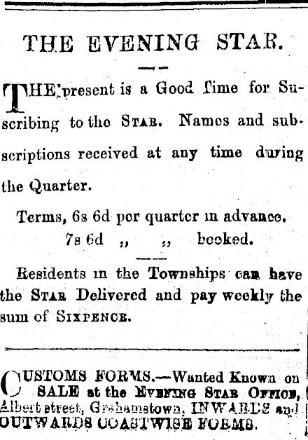 THE EVENING STAB. rpHE^presenfc is a Good Time for Suscribing to the Sxab. Names and subscriptions received at any time daring the Quarter. Terms, 6s 6d por quarter in advance, 7b 6d „ ;, booked. Eesidents in the Townships can have the Stab Delivered and pay weekly the sum of Sixpence. pUSXOMS IfOEMS.—Wanted Known on \J SALE at the EvnriKO Stab Ofpios, { Albsi-fcetfe&tvGr^hamstown. ISTWARLg »»■-' I OUTWARDS UOAjSTWWi FUfiMB. " j