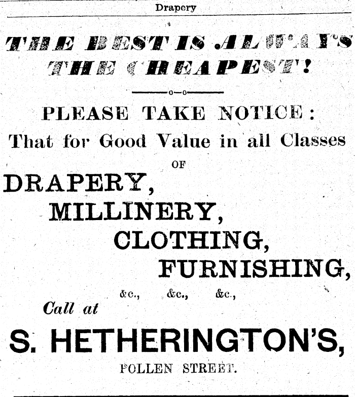 Drapery _j ■ ■ ■■* ■ ' : wmes i'Mt&iAVEmm 1'! : ■ PLEASE TAKE NOTICE : That for Good Value in ail Classes OF DRAPERY, MILLINERY, CLOTHING, FURNISHING, . &c, &c, &c, ! Call at S. HETHERINGTON'S, : • ' POLLEN STREET. .