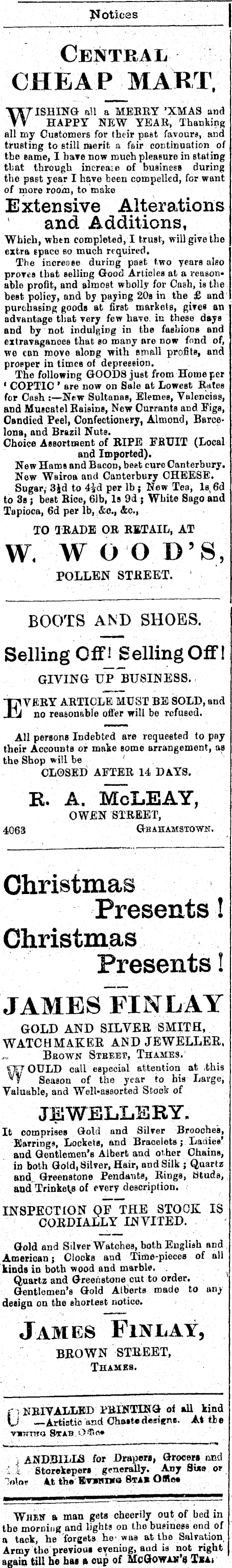 Notices Centra ii CHEAP_MART. WISHING all a MEBRY 'XMAS and HAPPY NEW YEAB, Thanking all cay Customers for their past favours, and trusting to still merit a fair continuation of the same, I have now much pleasure in stating tbat through increase of buainesß during the past year I have been compelled, for want of more room, to make Extensive Alterations and Additions, Which, wbtn completed, I trust, will give the extra space bo much required. The increase during past two years also proves that selling Good Articles at a reasonable profit, and almost wholly for Cash, is the best policy, and by paying 20s in the £ and purchasing goods at first markets, gives an advantage that very few have, in these days and by not indulging in the fashions and extravagances that so many are now fond of, we con move along with arnall profits, and prosper in times of depression. The following GOODS just from Home per 1 COPTIC ' are now on Sale at Lowest Bates for Cash :—New Sultanas, Elemee, Valencies, and Muscatel Baisins, New Currants and Figs, Candied Peel, Confectionery, Almond, Barcelona, and Brazil Nuts. Choice Assortment of BIPE FBUIT (Local and Imported). New Hams and Bacon, beet cure Canterbury. New Wairoa and Canterbury CHEESE. Sugar,' 3Jd to 4£d per 1b; New Tea, ls,6d to 3s; best Bice, 61b, Is 9d ; White Sago and Tapioca, 6d per lb, &0., &c, TO TBADE OB BETAIL, AT W. W O O D'S, POLLEN STREET. BOOTS AND SHOES. Selling Offj_ Selling Off! GIVING UP BUSINESS. T7I VfißY ABTICLE MUST BE SOLD, and Jjj no reasonable offer will be refused. All persons Indebted are requested to pay their Accounts or make some arrangement, as the Shop will be CLOSED AFTEB 14 DAYS. R. A. McLEAY, OW£N 'STREET, 4063 Q-HAHAMSTOWN. Christmas Presents! Christmas Presents! jameslfinlay GOLD AND SILVER SMITH, WATCHMAKER AND JEWELLER. BaowN Stbeet, Thames. O7 OULD call especial attention at ,this 'T Season of the year to his Large, Valuable, and Well-asaorted Stock of JEWELLERY. It comprises Gold and Silver Brooches, Earrings, Lockets, and Bracelets; Ladies' and Gentlemen's Albert and other Chains, in both Gold, Silver, Hair, and Silk ; Quartz and. Greenstone Pendants, Bings, tituds, and Trinkets of every description. INSPECTION Q? THE STOCK IS CORDIALLY INVITED. Gold and Silver Watches, both English and American; Clocks and Time-pieces of all kinds in both wood and marble. . Quartz and Greenstone cut to order. Gentlemen's Gold Alberts made to anj design on the shortest notice. James Finlay, BROWN STREET, Thames. f '. KBIVALLBD FAINTING oi all kind U —Artistic and Chait«deei«ne. A* tie VBW-7TO Stab Ofta* i ANDBILLS for Drapera, Grocew and I i Storekepera generally. Any Sixe or -:n\ov 4t th» Hvm»nr» Btab O«<» Whew a man gets cheerily out of bed in the morning and lights on tho business end of a tack, he forgets he was at the Salvation. Army the previous evening, aud is not right again till be has A cup of McGowan'B Tsa,