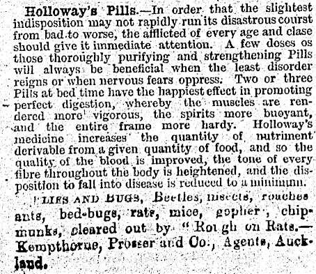 Holloway'fl Pills.— ln order that the slightest indisposition may not rapidly run its disastrous courst from bad .to worse, the afflicted of every age and clase should give it immediate attention. A few doses os those thoroughly purifying and strengthening Pills " will always be "beneficial when the least disorder j rei"ns or when nervous fears oppress; Two or three Pills at bed time have the happiest effect in promoting - perfect digestion, whereby the muscles are rendered inoro' 1 vigorous, the spirits more buoyant, ■and the entire frame more hardy. Holloways medicine increases 1 the quantity of, nutriment' derivable from a given quantity of food, and so the quality of the blood is improved, the tone of every •fibre throughout the body is heightened, and the dis- " position to fall into disease is reduced to a minimum. ililES AtHV UVGtH, .Beetles, iiist-eta, rouciiea ants, bed-bugs,-Tat*,""mice, gopher-, chipmtmka, cleared out by "Hoigii on Bats.— KempMuHW, Proiser'Jui'd Oo: ; Agents, Auck- • tod. ■' '. ' •'; ' '; ; :
