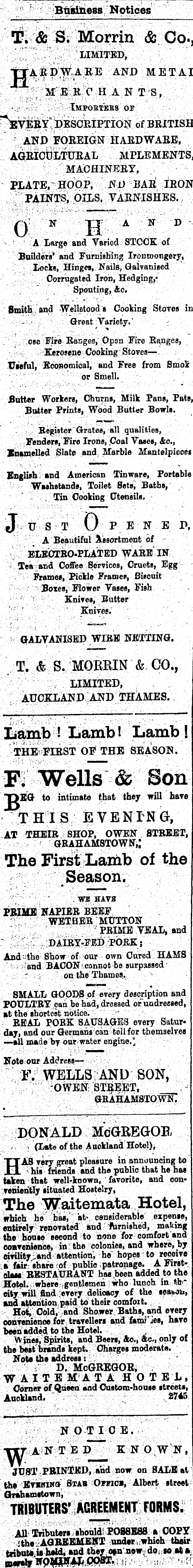 7 Business Notices T. & S. Morrin & Co., ' , . LIMITED, TTARD^AEE AND METAI MtEO HANTS, • . • Tmpohters of of BRITISH AND FOREIGN HAEDWAKE, AGEICtJLTUEAL MPLEMENTS, MAOHINEEY, PLATE,~ HOOP, ND UAE lEON PAINTS, OILS, VAENISHES. ONH A X D A Large and Varied STOCK of Builders' and Furnishing Ironmongery, Locks, Hinges, Nails, Galvanised Corrugated Iron, Hedging,' Spouting, &c. Smith and Wellotood s Cooking Stoves in - • Great Variety." ,ose Fire Ranges, Opsn Fire Ranges, -Kerosene Cooking Stoves— Uieful, Ecoaomical, and Free from Smok or Smell. Butter Workers, Churns, Milk Pans, Pats, Butter Prints, Wood Butter Bowls. . Register Grates, all qualities, Fenders, Fire Irons, .Coal Vases, &c, JBnunelled Slate and, Marble Mantelpiece! English and American Tinware, Portable Wsshstands, Toilet Sets, Baths, , Tin Cooking Utensils, Just Opened, A Beautiful Assortment of BLEpTBO-PLATED WARE IN Tea and Coffee Services, Cruets, Egg Frames, Pickle Frames, Biscuit j Boxes, Flower Vases, Fish ' ' Knives, Sutter 1 Knives. GALVANISED WIRK NETTING. T. & S. MORBIN & CO., LIMITED, AUCKLAND AND THAMES. Lamb ! Lamb! Lamb! THE'FIEST OF THE SEASON. F; WeUs & Son "DEO- to intimate that they will have THIS EVENING, AT THEIR SHOP, OWEN STREET, GRAHAMSTOWN,: The First Lamb of the Season. . WE HAVB PRIME NAPIER BEEF WETHER MtJTTON PRIME VEAL, and . . DAIRX-FED PORK; And tho Show of our own Cured HAMS - . .'and BACON.cannot be surpassed - .- on the Thames. SMALL GOODS of every description and POULTRY can be had, drassed or undressed, at the shortest notice. BEAL PORK SAUSAGES every Saturday, and our Germans can toll for themselves —all made by our water engine.;; Note onr Address— F. WELLS AND SON, -OWEN: STEEET, GRAHAMSTOWN. DONALD MdGBEGOB. ; (Late of the Auckland Hotel), HAS very great pleasure in announcing to < his friends and the public that he has taken that well-known, favorite, and conveniently situated Hostelry, The Waitemata Hotel, which he hag, at* csnsiderable expense, entirely renovated and furnished, making the home second to none for comfort and convenience, in the colonies, and where, by civility;, and attention', he hopes to receive a fair, share of public patronage. A First-. fl i«M RESTAURANT has been added to the Hotel, where gentlemen who lunch in tbr city will find every delicacy of the aeabOb, and attention, paid to their comfoit.. Hot, Cold, -and Shower. Baths, and every convenience for travellers and fami'ies, have been added to the Hotel. Wines, Spirits, and Beers, &0., &c, only of the best'brands kept. Charges moderate. Note the address: _ ■ < D. McGREGOE, . WAITEMATA HOTEL, Corner of Queen and Custom-house streets, Auckland. " . . ,2745 NOT ICE. TT7 A N T E D KNOWN, JUST PRINTED, and now on SALE at the EvunNCt. Stab Owioa, Albert street Grahamstowa, TRIBUTERS 1 AGREEMENT FORMS. All Tributeri should POSSESS a COPY Jthe AGBEEMENT under, .which their tribute is held, and they. o»n now, do so at a Sf^ffp^fAli.flP&T,;^, /;,;■ ■,;.!