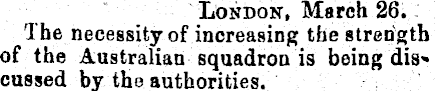 London, March 26. ,i The necessity of increasing the strength of the Australian squadron is being dis» cussed by the authorities.