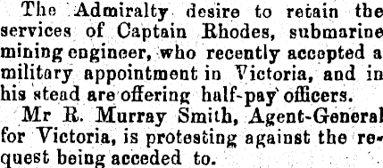 The Admiralty desire to retain the services of Captain Rhodes, submarine mining engineer, who recently accepted a military appointment in Victoria, and in his stead are offering half-pay" officers. Mr R. Murray Smith, Agent-General for Victoria, is protesting against the request being acceded to.