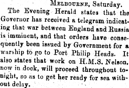 Melboubne, Saturday. The Evening Herald states that the Governor has received a telegram indicating that war between England and Bussia is imminent, and that orders have consequently been issued by Government for a warship to go to Port Philip Heads. It also states that work on H.M.S« Nelson, now in dock, will proceed throughout tonight, bo as to get her ready for sea without delay.