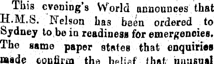 This evening's World announces that H.M.S. Nelson has been ordered to Sydney to be in readiness for emergencies. The same paper states that enquiries made confirm the b^lisf that unusual