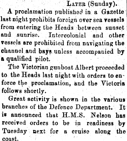 Lateb (Sunday). A proclamation published in a Gazette last night prohibits foreign over sea vessels from entering the Heads between sunset and sunrise. Intercolonial and other vessels are prohibited from navigating the channel and bays unless accompauied by a qualified pilot. Tbe Victorian gunboat Albert proceeded to the Heads last night with orders to enforce the proclamation, and the Victoria follows shortly. Great activity is shown in the various | branches of the Defenco Department. It is announced that H.M.S. Nelson has received orders to be in readiness by Tuesday next for a cruiso along the coast.