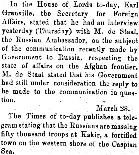 In the House of Lords to-day, Earl Granville, the Secretary for Foreign Affairs, stated that he had an interview yesterday (Thursday) with M. de Staal, the Russian Ambassador, on the subject of the communication recently made by Government to Eussia, respecting the state of affairs on the Afghan frontier. M. de Staal stated that his Government had still under consideration the reply to be made to the communication in question. . '..-''■,/ ,-'.•■ March 28.' The Times of to-day publishes a telegram stating that the [Russians are massing fifty thousand troops at Eakir, a fortified town on the western shore of the Caspian Sea.