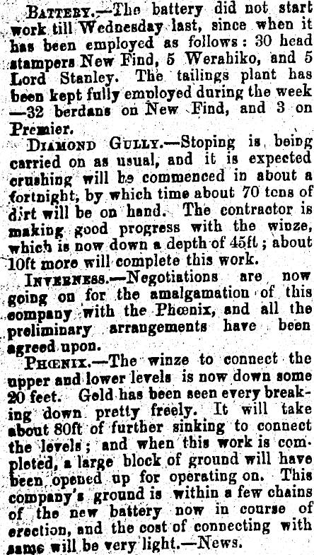 BATTEBT.r-Thß battery did not start ■ work till Wednesday last, since when it has been employed as follows: 30 head •tampers New Find, 5 Werahiko, and 5 Lord Stanley. The tailings plant has been kept fully employed during the week 32 berdans on New Find, and 3 on Premier. . . .» Diamond Guilt.—Stopmg is, bemg carried on as usual, and it is expected crashing will ba commenced in about a fortnight, by which time about 70 tons of dirt will be on hand. The contractor is making good progress with the winze, which is now down a depth of 45ft; about "10ft more will complete this work. InvJtßHiss.— Negotiations are, now coing on for the amalgamation ■of this ..company With the Phoenix, and all the .preliminary . arrangements have been •greed.upon. Ph<ehix.—The winze to connect the upper and lower levels is now down some 20 feet. Geld has been seen every break- < ing down, pretty freely. It will take •boat 80ft of further sinking to connect the levels; and when this work is completed, a large block of ground will have been opened up for operating on. This company's ground is within a few chains of the new battery now in course of erection, and the cost of connecting with Mine will be very light.—News.