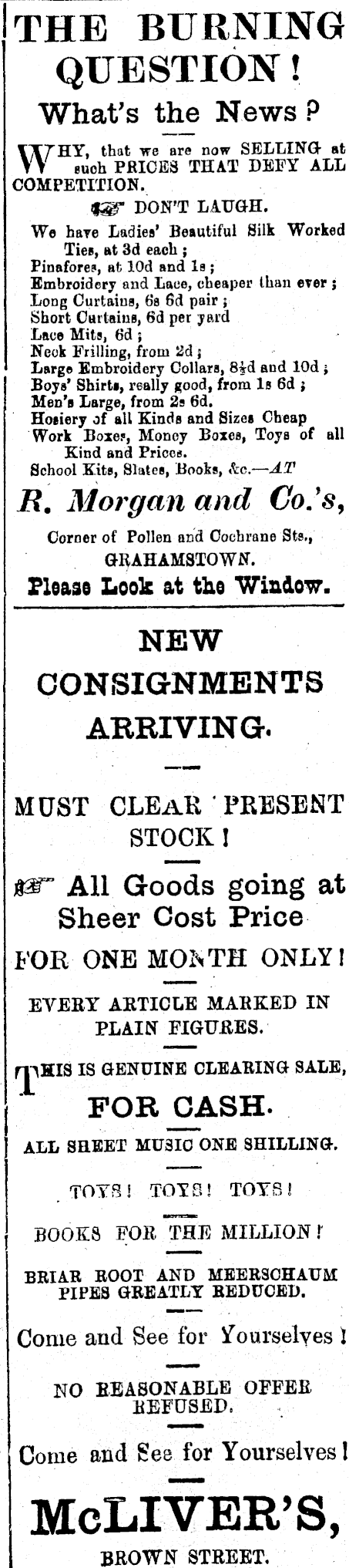 THE BURNING QUESTION! What's the News P WHY, that we are now SELLING- at euoh PRICES THAT DEFY ALL COMPETITION. |^r DON'T LAUGH. We have Ladies' Beautiful Silk Worked Ties, at 3d each ; Pinafores, at lOd and la ; Embroidery and Lace, cheaper than ever ; Long Curtains, 6s 6d pair ; Short Curtaiuß, 6d per yard Lace Mits, 6d; Neck Frilling, from 2d j Large Embroidery Collars, Bid and lOd s Boys' ShirU, really good, from Is 6d ; Men's Large, from 2s 6d. Hosiery of all Kinds and Sizes Cheap Work Boxer, Money Boxes, Toys of all Kind and Prices. School Kits, Slates, Books, &c— AT R. Morgan and Co.'s, Corner of Pollen and Oochrane Sts., GRAHAMSTOWN. Please Look at the Window. NEW CONSIGNMENTS ARRIVING. MUST CLEAR PRESENT STOCK! nsr All Goods going at Sheer Cost Price FOR ONE MOIsTH ONLY! EVERY ARTICLE MARKED IN PLAIN FIGURES. mHIS IS GENUINE CLEARING SALE, FOR J3ASH. ALL SHEET MU3IO ONE SHILLING-. TOYS! TOYS! TOYS! BOOKS FOR THE MILLION! BRIAR ROOT AND MEERSCHAUM PIPES GREATLY SEDUCED. 1 Come and See for Yourselves i NO REASONABLE OFFER [ REFUSED. 1 Come and See for Yourselves I McLIVER'S, BROWN STREET.