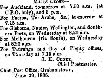 MAIIB OiOSK — For Auckland, to-morrow at 7.50 a.m. (at C.P.O. only),.and 5 p.m. For Paeroa, Te-Aroha, &c., to»aior.row at 7.15 a.m. , For Gisborne, Napier, Wellington, and Southern Ports, on Wednesday at 8.201».m. For Melbourne (via South), on Wednesday at 8.20 a.m. For and Bay of Plenty ofßcea, on Thureday at 7.15 a.m. ..:■■'■■ J. B. Conex, Chief Postmaster. Cbi«t.Post Office, GrahaiDßtown, June 29; 1885.