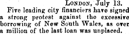 London, July 13. Five leading city financiers have signed, a strong protest against the excessive borrowing of New South Wales, as over a million of the last loan was unplaced.