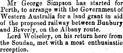 Mr George Simpson Las started for Forth, to arrange with the Government of Western Australia for a land grant in aid of the proposed railway between Bunbury and Beverly, on the Albany route. Lord Wolseley, on his return here from the Soudan, met with a most enthusiastic reception.