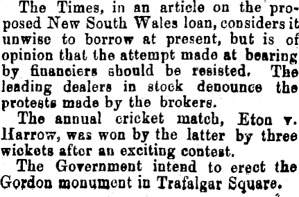 The Times, in an article on the proposed New South Wales loan, considers it unwise to borrow at present, but is of opinion that the attempt made at bearing by financiers should be resisted. The leading dealers in stock denounce the protests made by the brokers. The annual cricket match, Eton r. Harrow, was won by the latter by three wickets after an exciting contest. The Government intend to erect the Gordon monument in Trafalgar Square.