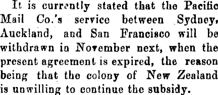 It is currently stated that the Pacific Mail Co.'s service between Sydney. Auckland, and San Francisco will be withdrawn in November next, when the present agreement is expired, the reason being that the colony of New Zealand is unwilling to continue the subsidy.