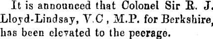It is announced that Colonel Sir E. J. Lloyd-Lindsay, V.C , M.P. for Berkshire, has been elevated to the peerage.