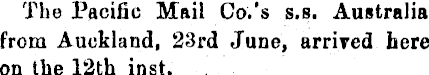 The Pacific Mail Co.'s s.s. Australia from Auckland, 23rd June, arrived here on the 12th inst.