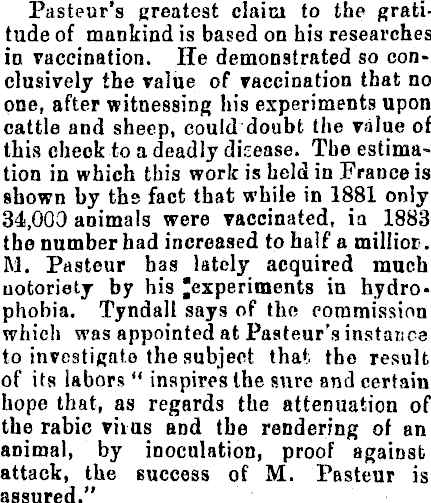 Pasteur's greatest claim to the gratitude of mankind is based on bis researches in vaccination. He demonstrated so conclusively the value of vaccination that no pne, after witnessing his experiments upon cattle and sheep, could doubt the value of this check to a deadly disease. The estimation in which this work is held in France is shown by ths fact that while in 1881 only 34,000 animals were vaccinated, in 1883 the number had increased to half a millior. M. Pasteur has lately acquired much notoriety by his "experiments in hydro• phobia. Tyndall says of the commission which was appointed at Pasteur's instance to investigate the subject that the result of its labors " inspires the sure and certain hope that, as regards the attenuation of the rabic vitus and the rendering of an animal, by inoculation, proof against attack, the Buccess of M. Pasteur is assured."