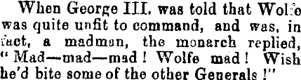 When George 111. was told that Wolfe was quite unfit to command, and was, in tact, a madman, the monarch replied, " Mad—mad—mad ! Wolfe mad ! Wish he'd bite some of the other Generals 2"