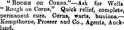 "Rough ok Cobns."—Ask for WelU " Rough on Corns." Quick relief, complete, permanent cure. Corns, warta, bunions.— Kempthorne, Frosser and Co., Agents, Auckland.