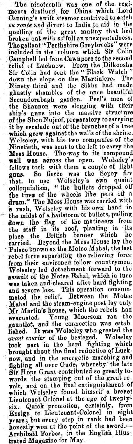 The nineteenth was one of the regiments destined for China which Lord Canning's swift steamer contrived to catch en route and divert to India to aid in the quelling of the great mutiDy that had broken out with scffull an unexpectedness. The gallant "Perthshire Greybroeks" were included in the column which Sir Colin Campbell led from Cawnpore to the second relief of Lucknow. From the Dilkoosha Sir Colin had sent the " Black Watch" down the slope on the Martiniere. The Ninety third and the Sikhs had made ghastly shambles of the once beautiful Secunderabagh garden. Peel's men of the Shannon were slogging with tlfeir ship's guns into the massive structure of the ShonNujeof, preparatory to carrying it by eacalade out of the branches of a tree which grew against the walls of the shrine. Wclseley, with his two companies of the Ninetieth, wbb sent to the left to carry the Mess House. The way to its compound - wall was across the open. Wolseley's fellows took with them a couple of light guns. So fierce was the Sepoy fire that, to use Wolseley's own quaint colloquialism, " the bullets dropped off the tires of the wheels like peas off a drum." The Mess House was carried with a rush, Wolseley with his own hand in " fche midst of a hailstorm of bullets, pulling down the flag of the mutineers from the staff in its roof, planting in its place the British banner which he carried. Beyond the Mess House lay the Palace known as the Motee Mahal, the last rebel force separating the relieving force from their environed fellow countrymen; Wolseley led detachment forward to the assault of the Notee Eahal, which in turn was taken and cleared after hard fighting and severe loss. This operation consummated the relief. Between the Motee Mahal and the steam-engine post lay only Mr Martin's house, which the rebels had evacuated. Young Moorsom ran the gauntlet, and the connection was established. It was Wolseley who greeted the avant courier of the besieged. Wolseley took part in the hard fighting which brought about the final reduction of Lucknow, and in the energetic marchiDg and fighting all over Oude, whereby the late Sir Hope Grant contributed so greatly towards the stamping out of the great re Tolt, ard on the final extinguishment of which Wolseley found himself a brevet Lieutenant Colonel at the age of twenty* six. Quick promotion, certainly, from Ensign to Lieutenant-Colonel in eight years; but every step in rank had been honestly won at the point of the sword.— Archibald Forbes, in the English Illustrated Magazine for May.