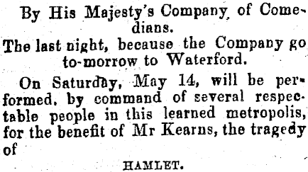 By His Majesty's Company, of Comedians. The last night, because the Company go to-morrow to Waterford. On Saturday, May 14, will be per« formed, by command of Eeveral respectable people in tbis learned metropolis, for the benefit of Mr Kearns, the tragedy of - ■ .. HAMLET.
