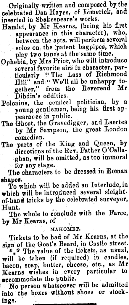 Originally written and composed by the celebrated Dan Hayes, of Limerick, and inserted in Shakespeare's works. Hamlet, by Mr Kearns, (being bis first appearance in this character), who, j between the acts, will perform several j golos on, the 'patent bagpipes, which play two tunes at the same time. Ophebia, by Mrs Prior, who will introduce several favorite airs in character, particularly " The Lass of Eichmond Hill" and " We'll all be unhappy together," from the Reverend Mr Dibdin's oddities. Polonius, the comical politician, by a young gentleman, being his first appearaoce in public. The Ghost, the Gravedigger, and Laertes by Mr Sampson, the great London comedian. The parts of the King and Queen, by directions of the Rev. Father O'Callaghan, will be omitted, as too immoral for any stage. m The characters to be dressed in Roman shapes. To which will be added an Interlude, in which will be introduced several sleight-of-hand tricks by the celebrated surveyor, Hunt. „ The whole to conclude with the Farce, by Mr ICearns, of \ MAHOMET. Tickets to be bad of Mr Keams, at the sign of the Goat's Beard, in Castle street. %* The value of the tickets, as usual, will be taken (if required) in candles, bacon, soap, butter, cheese, etc., as Mr Seams wishes in every particular to accommodate the public. . . No person whatsoever will be admitted into the boxes without shoes or stockings. -,