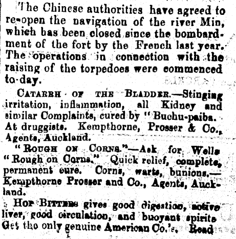 fI he Chinese authorities have agreed to re-open the navigation of the river Mm, whkfh has been closed since the bombard* ment of the fort by the French last year. The-operations in connection with .the raising of the torpedoes were commenced to-day. , t v Catabbk - or the Bladdsb.—Stingiif .irritation, inflninnmtioD, all Sidney and similar Complaints, cured by " Buohu-paiba. ■ At druggist*. Kerapthorne, Prosser i, 00. % A/eenti, Auckland. ----- .-,. "Bouoh ok CoßNa."—A»k for, W«H» *'Sough phOanu/* Quick relief, obnpletau permanent ewe. Oorni, wart*, bontona. Prossar and Co., A«entj, Anckland. S HOF BrTTBBB giTM good (KgWtiao, M)tl>O liver, pood oircalaUoo, and buoyant tpirita OeS tho only genuine Amerioro Co.'?, Uea4 ,