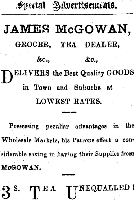 JAMES McGOWAN, GEOCBE, TEA DEALEE, &c, &c, T\ELIVEES the Best Quality GOODS in Town and Suburbs al LOWEST EATES. Possessing peculiar advantages in the Wholesale Markets, his Patrons effect a considerable saving in having their Supplies from MoGOWAN. OS. miA TTNEQUALLED!