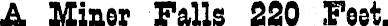 About half-past nine o'clock this morning a very narrow escape from instantaneous death occurred at the Prince Imperial mine. It appears that the " boss "of the shift—James Brownlee—had come to the surface for tie purpose of getting some timber. Having loaded the cage, he got on top of the timber, at the same time grasping the chain, and gave the signal to lower to No. 4 lerel. This was done, the engine-driver lowering the cage sufficiently below the level to enable Brownlee to step out on to the chamber. As is wellknown, there are three compartments in the shaft, including the ladderway, which is on the southern side, and is boarded over. He proceeded down the southern—or centrecompartment of the shaft, and on alighting at No. 4 level it is surmised 'that he proceeded, as he thought, to pass over the ladderway to "ring up." Instead of doing this, however, he must bare mistaken the compartments, and stepped into the open one on the northern end, with the result that he was precipitated to No. 7 level—a distance of about 220 feet. A man named Thomas Clark, who is also employed in the mine, was at No. 5 level at the time, and heard a noise as of some> thing falling down the shaft, followed by Gries of help. He promptly gate the alarm, and in three or four minutes' he, in company with some of his mates, arrived at No. 7 level, where they found the poor fellow clinging to the guidein the shaft, by which he held himself above the water in the well hole. He was at once conveyed to the Hospital, where Dr Callan was promptly in attendance, and attended to his injuries. Had it not been that there was a depth of about ten feet of water in the well-hole, the unfortunate fellow must have been killed instantly. As it is, he is severely bruised and cut in various parts of the body, particularly at the back of the right shoulder and above the left temple, caused probably by con* tact with the sides of the shaft. He is unable to account as to how the accident occurred. Although no bones were broken, -the-.shock..to-ihß-syßtfim-wa»~vory—BcTerey the lungs were lacerated, and internal i hemorrhage has set in. The injuries sus» ! tamed are of so serious a character that it ' is feared that the sufferer's recovery is j almost hopeless.
