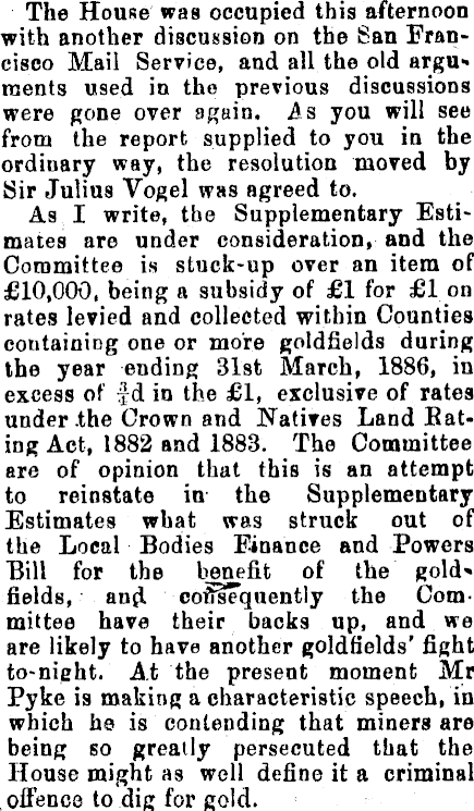 The House was occupied this afternoon with another discussion on the San Francisco Mail Service, and all the old arguments used in the previous discussions were gone over again. As you will see from the report supplied to you in the ordinary way, the resolution moved by Sir Julius Vogel was agreed to. As I write, the Supplementary Estimates are under consideration, and the Committee is stuck-up over an item of £10,000, being a subsidy of £1 for £1 on rates levied and collected within Counties containing one or more goldfields during the year ending 31st March, 1886, in excess of f d in the £1, exclusive of rates under .the Crown and Natives Land Eating Act, 1882 and 1883. The Committee are of opinion that this is an attempt to reinstate in- the Supplementary Estimates what was struck out of the Local Bodies Finance and Powers Bill for the benefit of the goldfields, and. coifsequently the Committee have their backs up, and we are likely to have another goldfields' fight to-night. At the present moment Mr Pyke is making a characteristic speech, in which he is contending that miners are being so greatly persecuted that the House might as well define it a criminal , offence to dig for gold.